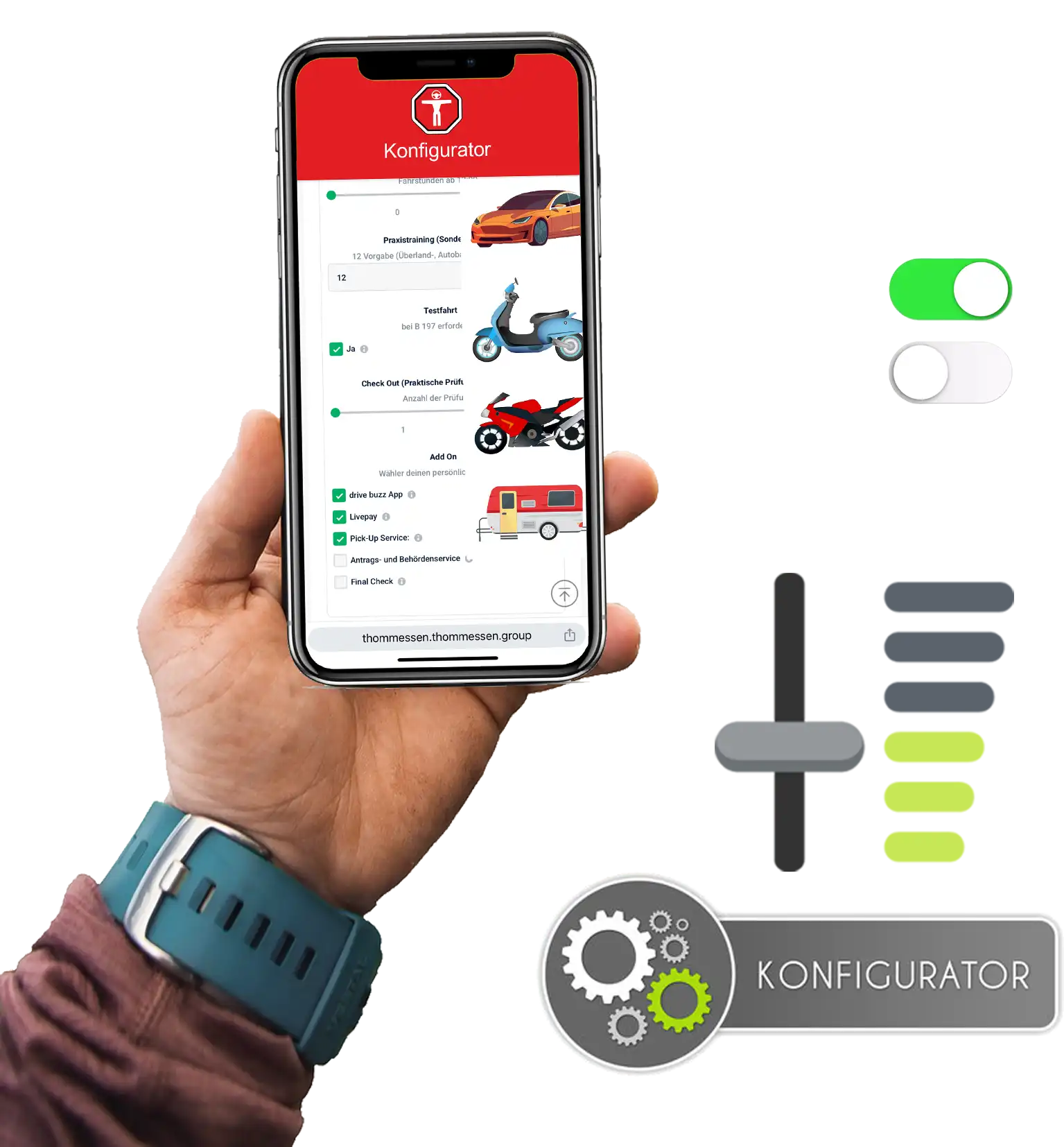 Wo du ihn findest? Geh im Menü auf Konfigurator und wähle Auto, Motorrad, Anhänger.oder Traktor.